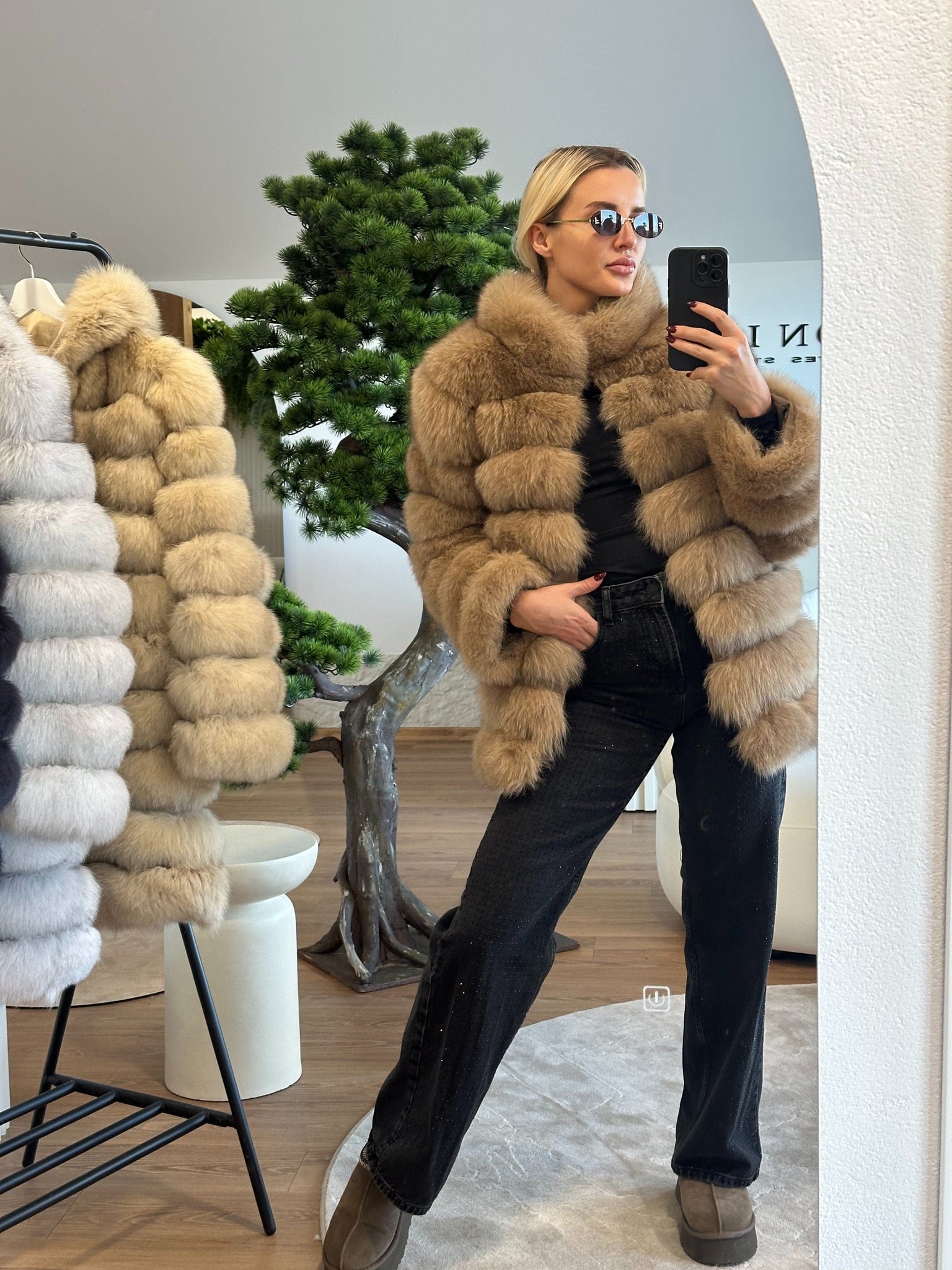 Kožuch ručne vyrobený so 100% najkvalitnejšou líščou kožušinou v jedinečnom sfarbení, má praktické kožušinové rukávy, ktoré sa dajú odopnúť pomocou starostlivo integrovaných mini zipsov, ktoré vám umožnia stiahnuť rukávy a kúsok nosiť aj ako kožušinovú vestu.